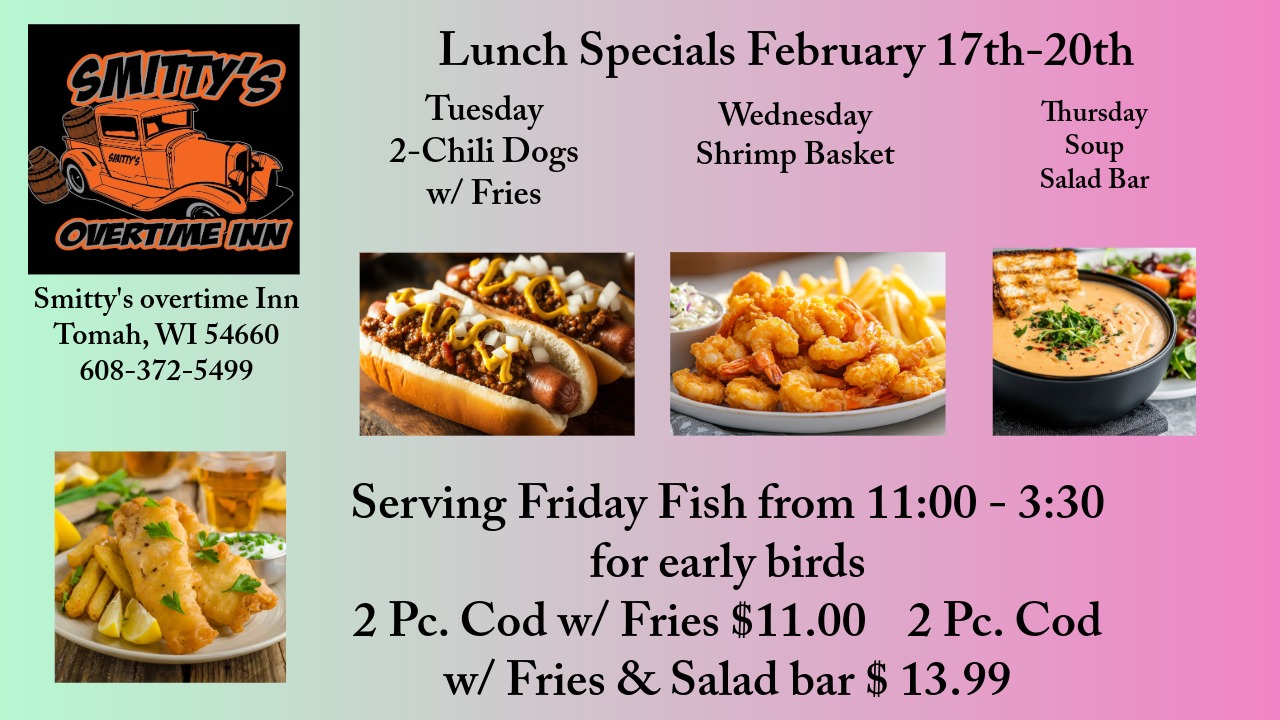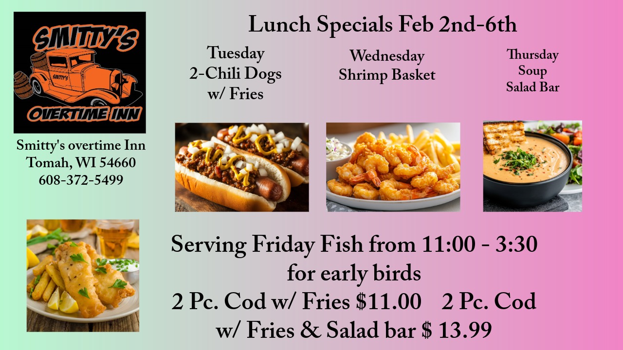 - Welcome to Smitty’s Overtime Inn, where great food, bold flavors, and good times come together! Dive into our signature Big Red Bloody Mary, then stick around for mouthwatering favorites like juicy burgers, crispy chicken and ribs, our famous Friday Fish Fry, and homemade pizzas hot from the oven. Craving something special? Don’t miss our tender prime rib and fresh seafood selections. Pair your meal with a drink from our rotating seasonal taps, featuring local brews like Spotted Cow, Hop and Barrel, and Crooked Grin, or sip on a glass of Cabernet, Moscato, or Chardonnay. We also serve 1919 Root Beer and a variety of Carbliss and Crook & Marker seltzers. Whether you're here for the food, the drinks, or the atmosphere — Smitty’s is your go-to spot for flavor and fun!